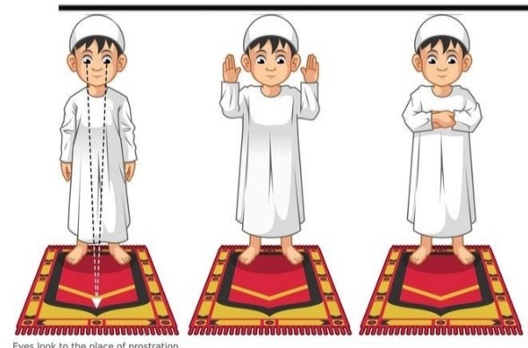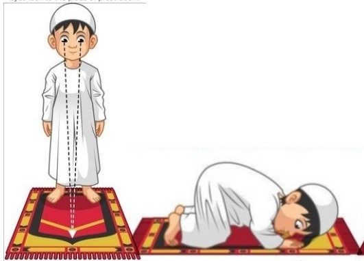 När du står och förbreddar dig till att be du ska titta vid den punkt på marken som pannan kommer att vidröra under sujud (nedfall), inte titta på andra ställer,