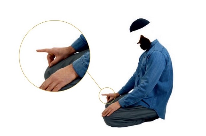 När du är klar med den andra Rak'ah sätter du dig för att göra tashahuda Sträck ut den högre handens pekfinger och peka rak fram, och läs följande: